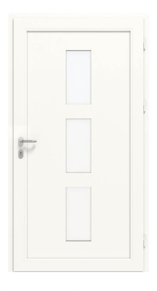Eleganckie drzwi zewnętrzne z trzema podłużnymi i satynowanymi przeszkleniami