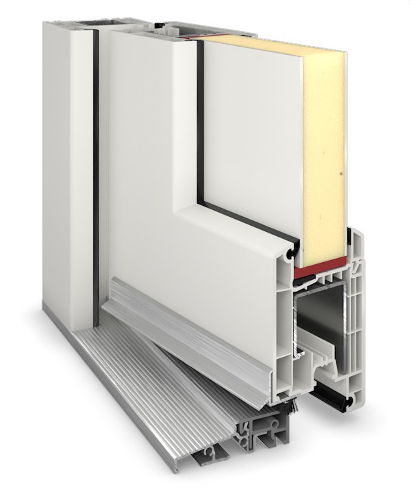 • Konstrukcja: trójstronnie stalowo-wzmocniona rama osłonowa z tworzywa sztucznego z profilem wielokomorowym, rama skrzydła z wielokomorowego profilu z tworzywa sztucznego, obwodowo wzmocniona stalą, wypełnienie typu sandwich 36 mm z rdzeniem XPS i pokryciem z tworzywa sztucznego, 2 poziomy uszczelnienia