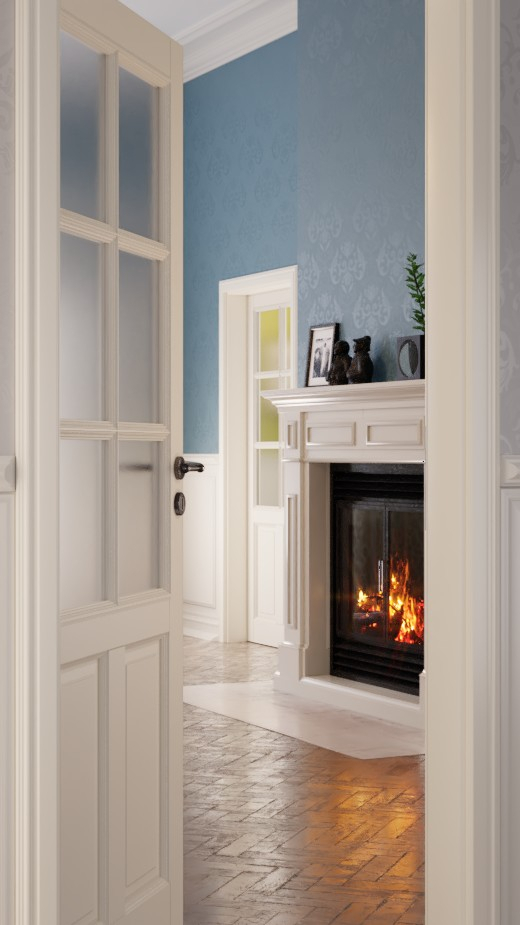 Duże wycięcie na szybę z drewnianym szprosem nakładanym nadaje drzwiom wyjątkowo delikatny wygląd. Szklane panele tworzą stylowe przejście między elementem szklanym a fryzem drzwiowym.
