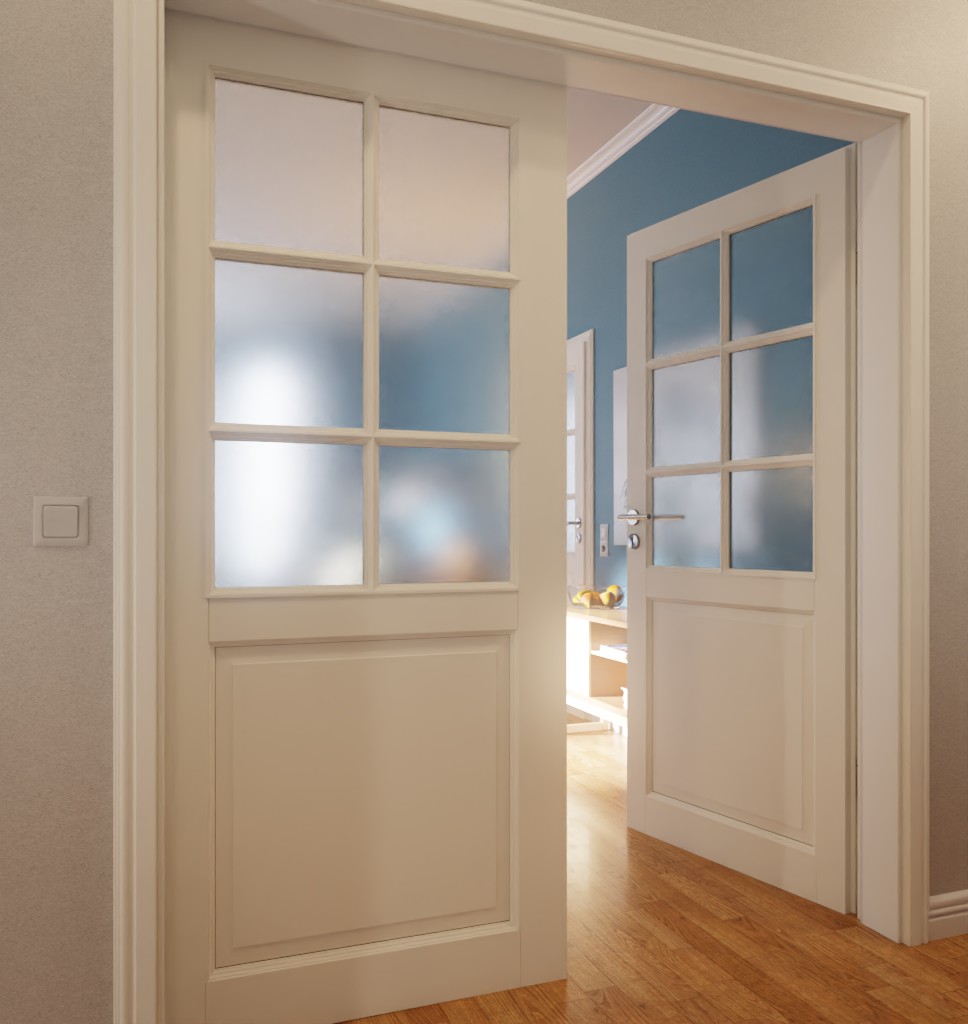 Duże wycięcie na szybę z drewnianym szprosem nakładanym nadaje drzwiom wyjątkowo delikatny wygląd. Jego uzupełnienie stanowi jednadrewniana kaseta na każde skrzydło drzwiowe oraz stylowa listwa profilowana.
