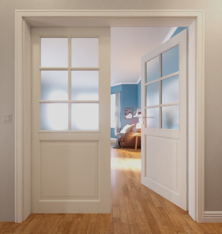 Drzwi lakierowane na biało z dwoma skrzydłami do otwartej przestrzeni: