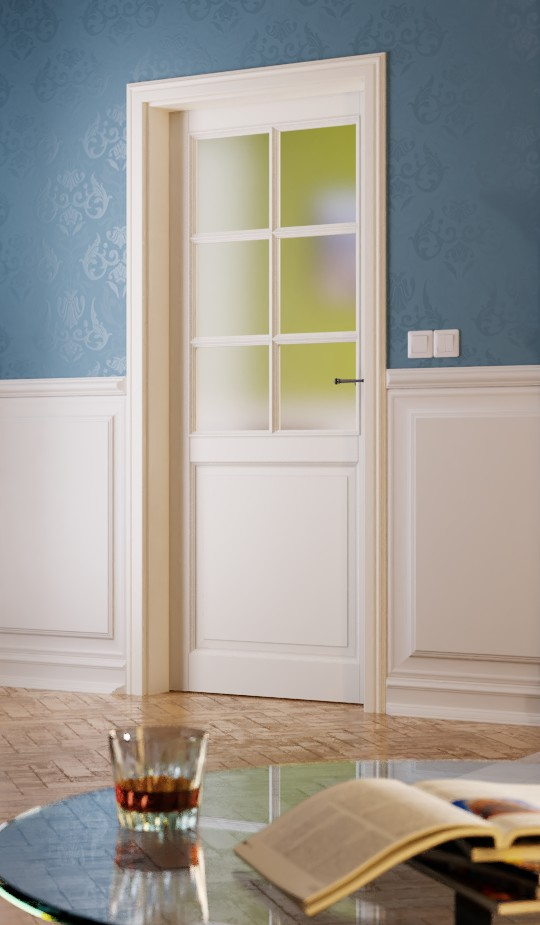 Duże wycięcie na szybę z drewnianym szprosem nakładanym nadaje drzwiom wyjątkowo delikatny wygląd. Szklane panele tworzą stylowe przejście między elementem szklanym a fryzem drzwiowym.