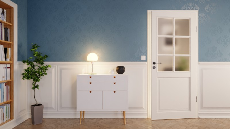 Solidna konstrukcja ramy jest zapewniona dzięki wysokiej jakości stolarki przemysłowej. Wysokiej jakości białe wykończenie dopełnia całościowy wygląd drzwi.