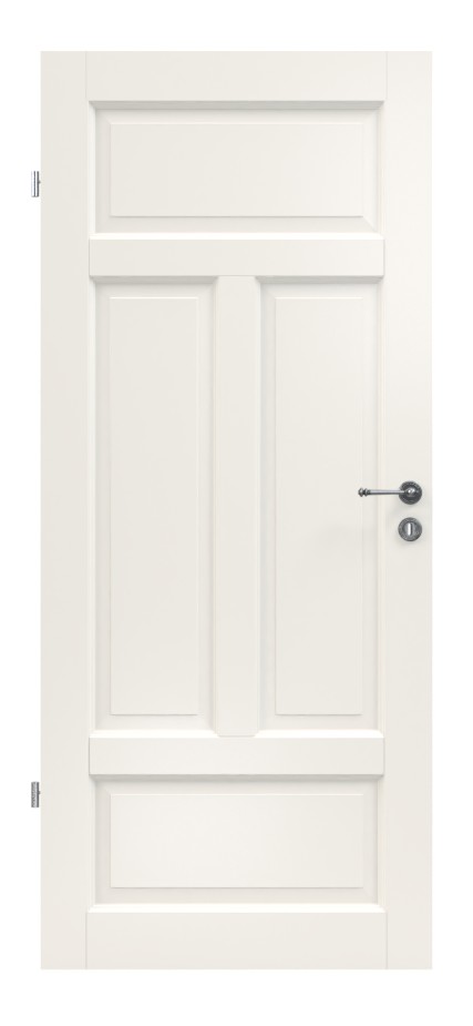 Drewniana kaseta jest włożona we frezę i poddana procesowi laminowania. Drewniane listwy nakładane na skrzydło drzwiowe są więc tutaj zbędne, co sprawia, że model ten stanowi unikat wśród drzwi lakierowanych na biało.