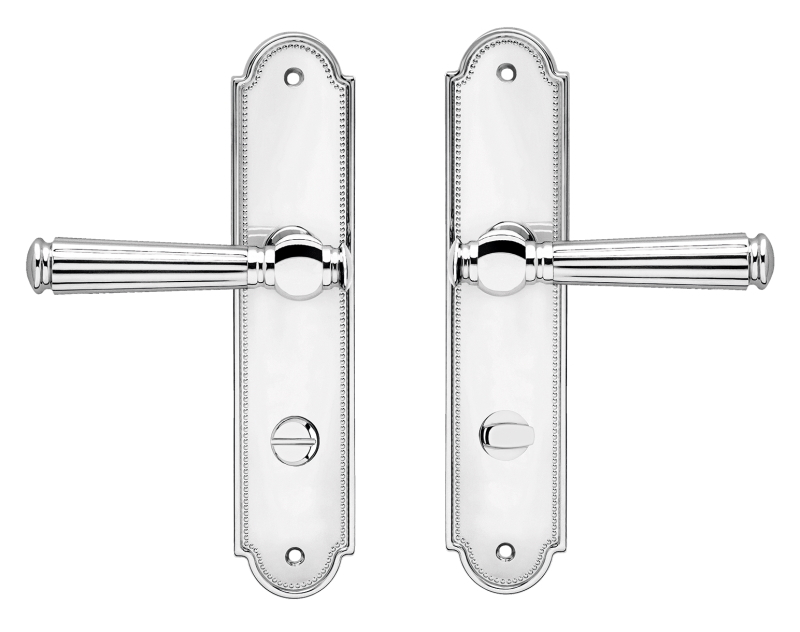 Chromowana powierzchnia z srebrzystym wyglądem tworzy majestatyczne wrażenie. Klamka drzwiowa jest wyposażona w podłużne i poprzeczne frezowania, które sprawiają, że uchwyt wygląda jak kolumna. W połączeniu z łukami i perłowym wzorem, które otaczają długą tarczę, powstaje elegancki wygląd.