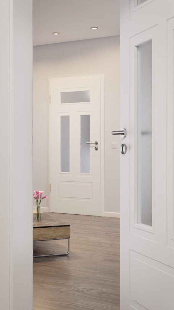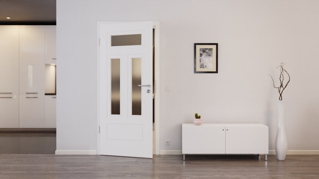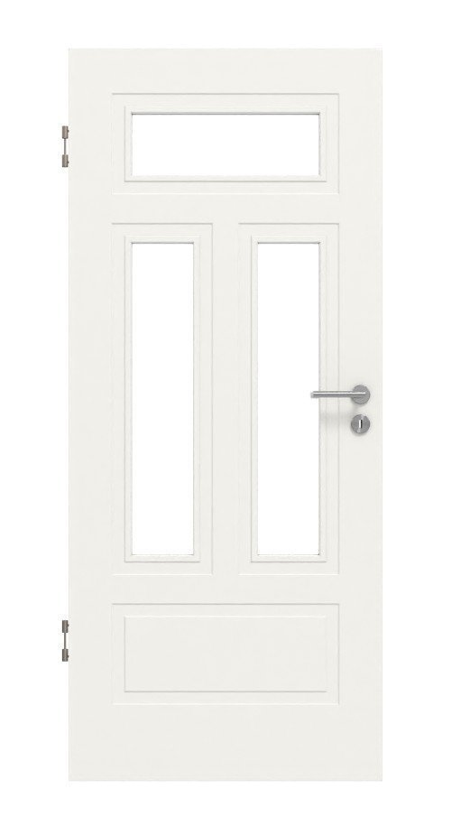 Geometryczny wzór i prosta ramka tworzą klasyczny wygląd, który pasuje do każdego wystroju wnętrza. Wysokiej jakości biała lakierowana powierzchnia w opcjonalnych kolorach RAL 9010 lub RAL 9016 zapewnia brilliantny blask. Przeszklenie dodatkowo wprowadza otwartą atmosferę w pomieszczeniu.