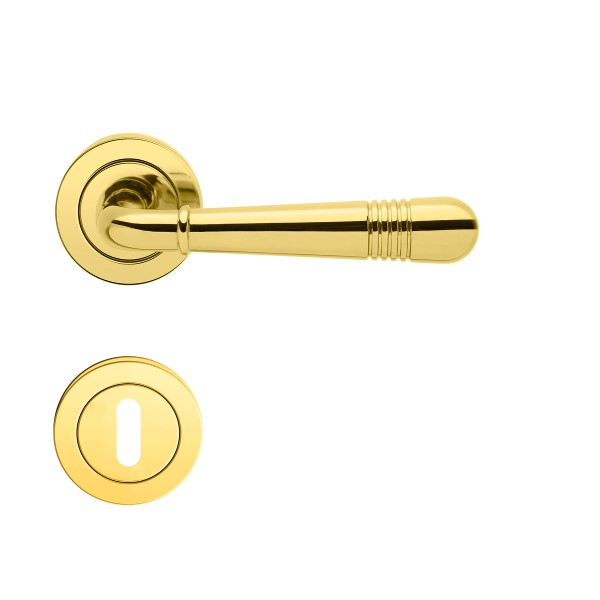 Zestaw pokryty jest polerowanym cyrkonią i emanuje eleganckim blaskiem. Uchwyt ma stożkowy kształt i jest ozdobiony delikatnymi frezowaniami. Okrągłe rozetki dopełniają klasyczny wygląd.