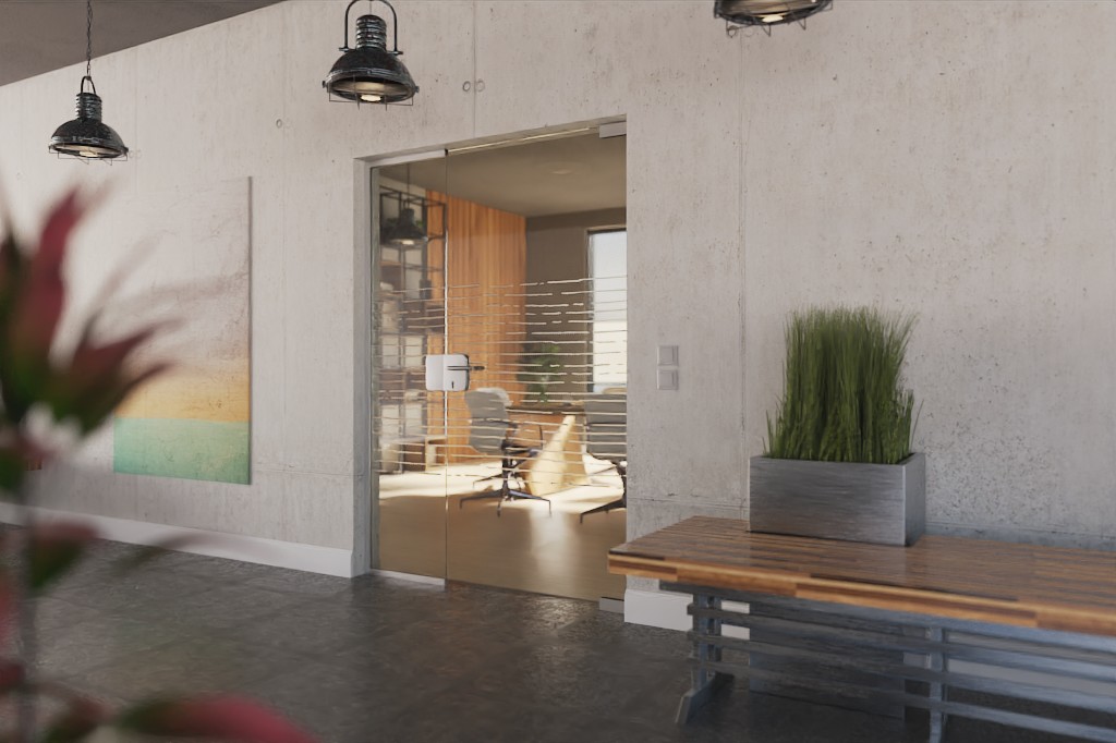 Trendy, całoszklane drzwi z boczną szybą, w tym najlepsze zawiasy DORMA Mundus: