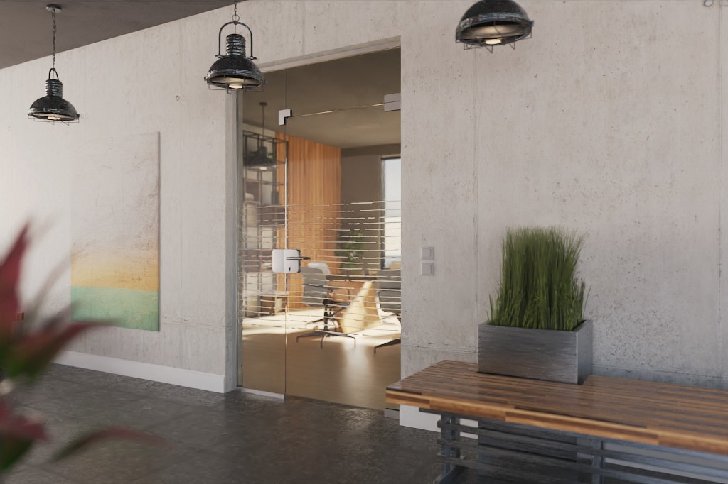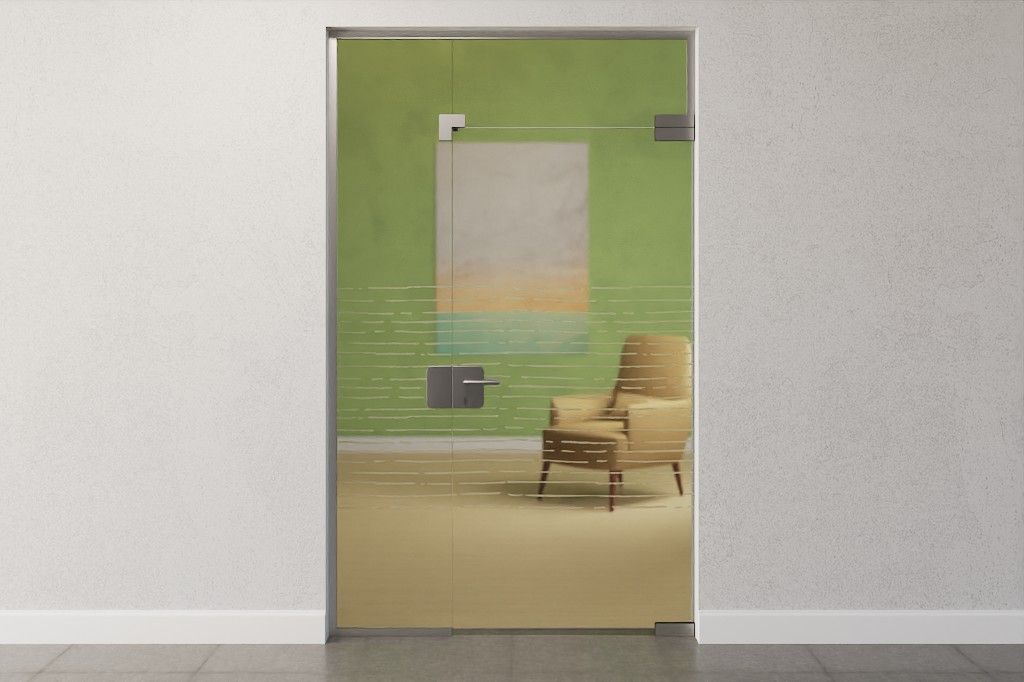 Modny wzór szkła: Stwórz płynne przejścia między pomieszczeniami dzięki całkowicie szklanej konstrukcji Dorma Mundus z Erkelenz . Zestaw składa się z nowoczesnych szklanych drzwi z szklanymi panelami bocznymi oraz naświetlem .