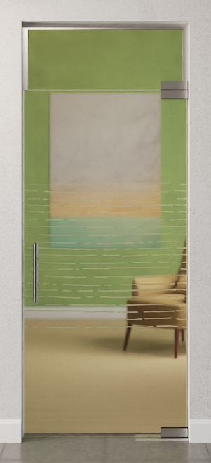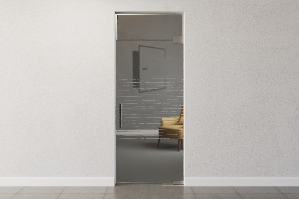 Stylowa całoszklana konstrukcja z drzwiami wahadłowymi i świetlikiem z trwałego i specjalnie pokrytego szkła bezpieczeństwa: