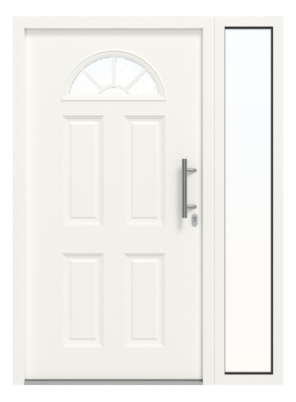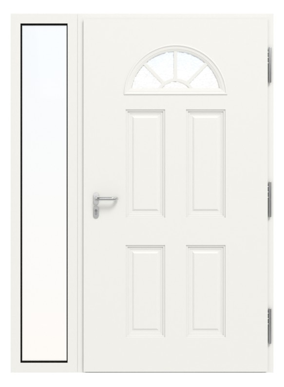 Wyjątkowo wyrafinowany design nadają mu kasety i eleganckie, łukowate przeszklenie z nakładanymi szprosami. Profilowana rama szklenia dopełnia całości. Zastosowane szkło ornamentowe tworzy piękny efekt świetlny. Znajduje również zastosowanie w dużej części bocznej, dzięki czemu wpada jeszcze więcej naturalnego światła dziennego, a jednocześnie zapewniona jest ochrona przed wzrokiem osób postronnych. Prostokątna rama osłonowa idealnie pasuje do drzwi, alternatywnie zaokrąglona rama może stanowić ładny kontrast.