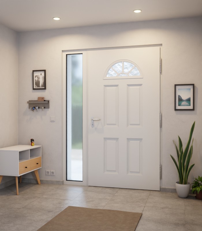 Termicznie oddzielona, stała część boczna może być połączona z drzwiami wejściowymi po lewej lub prawej stronie. Podwójne szyby termoizolacyjne z szkłem klejonym VSG na zewnątrz dopełniają konstrukcję.