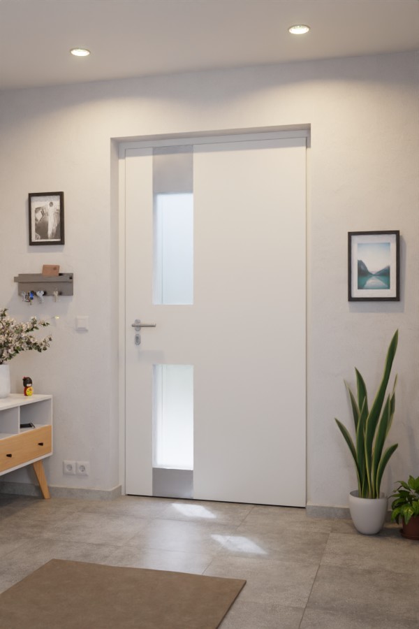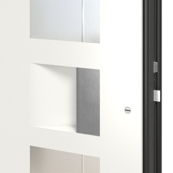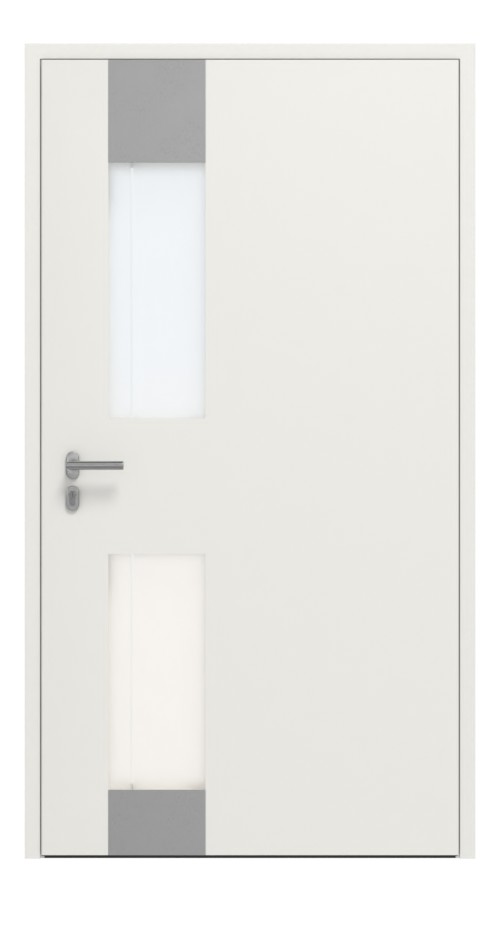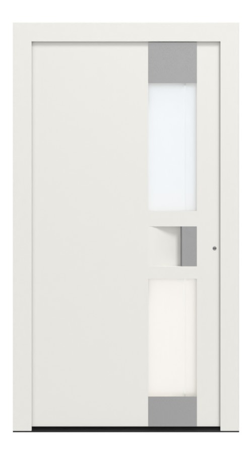Drzwi zewnętrzne aluminiowe na całej powierzchni mają dwie ramki ze szkła matowego typu float, umieszczone powyżej i poniżej okuć drzwiowych. W tych modelach znajduje się dyskretny, jasny biały pasek biegnący równolegle do listwy uchwytu. Szklane obramowania są zakończone dwoma aplikacjami ze stali szlachetnej.
