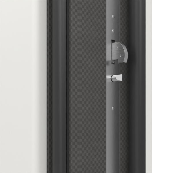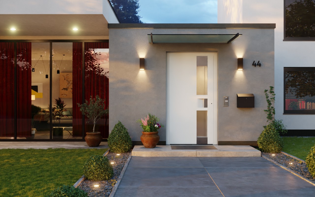 Drzwi wejściowe do domu mają profil skrzydła wykonany z hybrydowego materiału z włókna węglowego i szklanego. Dzięki zawiasom drzwiowym ukrytym drzwi wyglądają wyjątkowo elegancko i ekskluzywnie. Dzięki wkładce profilowej zabezpieczonej przed manipulacją drzwi zapewniają większe poczucie bezpieczeństwa. Rozeta cylindryczna zabezpieczająca jest zlicowana z powierzchnią i wyposażona w tarczę zabezpieczającą przed przewierceniem.