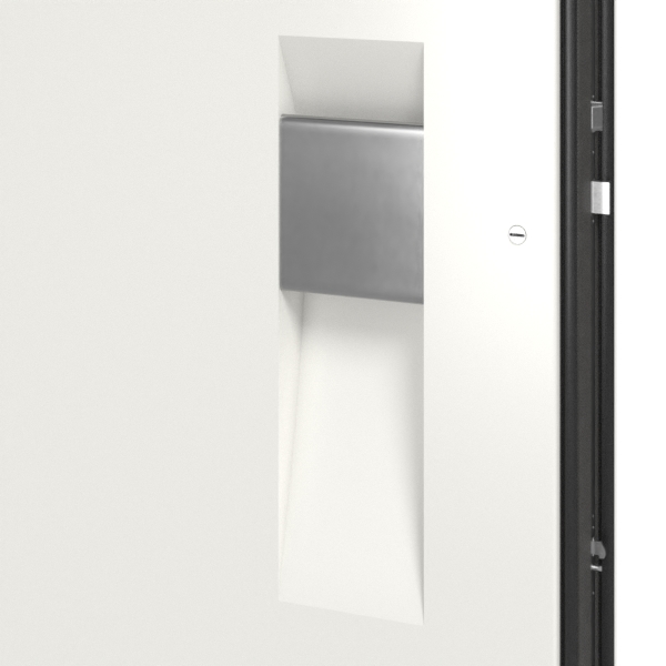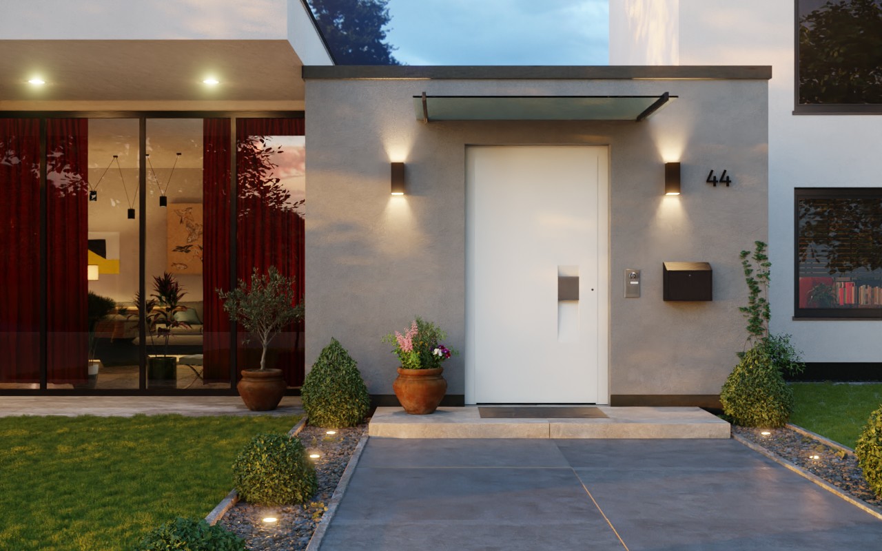 Eleganckie drzwi zewnętrzne klasy premium wyróżniają się ekskluzywnym designem i wysoką jakością wykonania. Najważniejszym elementem pełnopowierzchniowego skrzydła drzwiowego jest wpuszczana wnęka z uchwytem ze stali szlachetnej. Znajduje się on obok niezwykle dyskretnej rozety na klucz i zaokrąglonego elementu, który harmonijnie dopełnia wygląd nowoczesnych drzwi zewnętrznych.
