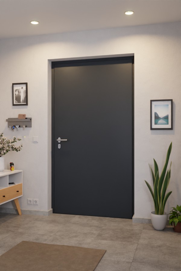 • Zakres dostawy: Drzwi wejściowe z ramą, progami, ukrytymi zawiasami, zamkiem, cylindrem profilowym z 5 kluczami, uchwytem zintegrowanym z listwą uchwytową, wewnętrznym przyciskiem, rozetą klejoną wewnątrz i rozetą cylindryczną na zewnątrz, dodatkowe elementy do skonfigurowania.