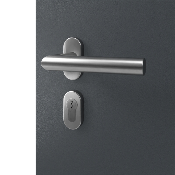 • Wersja standardowa zamka: Zamek bezpieczeństwa 9-punktowy H9 z listwą czołową ze stali szlachetnej do wysokości zewnętrznej 2600 mm; wkładka cylindryczna z przyklejoną rozetą antywyważeniową ze stali szlachetnej wewnątrz