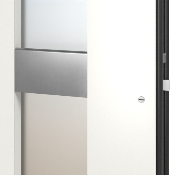 • Wersja standardowa zamka: Zamek bezpieczeństwa 9-punktowy H9 z listwą czołową ze stali szlachetnej do wysokości zewnętrznej 2600 mm; wkładka cylindryczna z przyklejoną rozetą antywyważeniową ze stali szlachetnej wewnątrz
