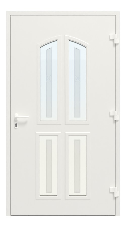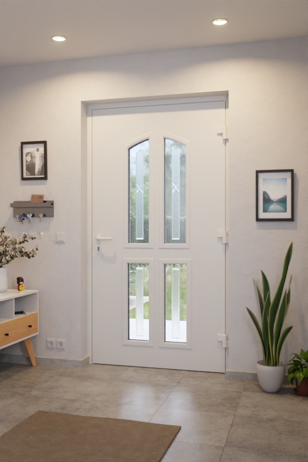 • Zakres dostawy: Drzwi wejściowe z ramą, progiem, zawiasami, zamkiem, cylindrem profilowym z 5 kluczami wielokrotnymi oraz 2 osłonami kluczy i okuciem z zewnętrznym uchwytem, wewnętrznym przyciskiem, rozetą klejową wewnątrz i pierścieniem rozetowym na zewnątrz, dodatkowe elementy do skonfigurowania.
