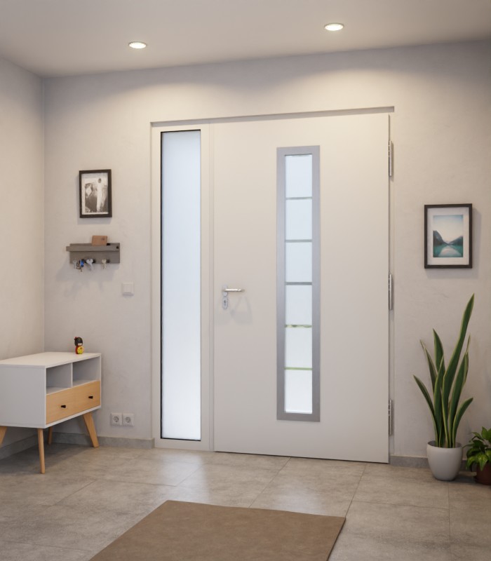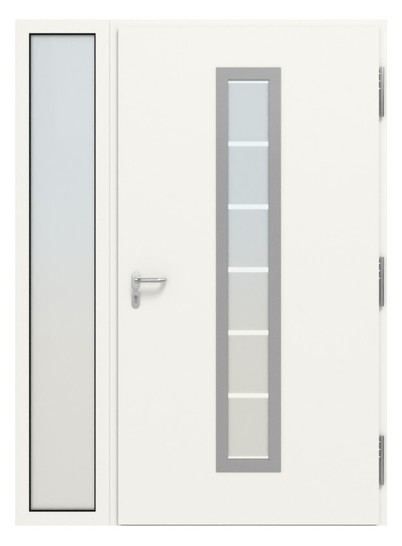 Solidne drzwi zewnętrzne z termicznie przerywaną budową i przezroczystym elementem bocznym.