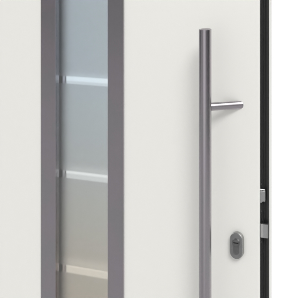 • Konstrukcja: ausgeschäumtes Stahl-Türblatt (46 mm) mit Hohlkammerprofil im Rahmen, thermisch getrennt; Alu-Kunststoff-Schwelle; thermisch getrennter Alu-Blendrahmen (60,5 mm); 2 umlaufende Dichtungen; thermisch getrenntes, feststehendes Seitenteil als Koppelanlage