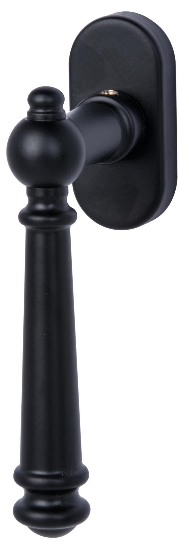 Pasująca do klamek drzwiowych o tej samej nazwie, klamka okienna imponuje skomplikowanymi detalami w stylu antycznym. Zakrzywione, pierścieniowe zdobienia i matowo-czarna powierzchnia celowo podkreślają ten model.