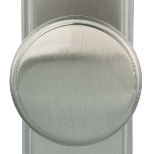 Stożkowy klamkę z okrągłymi zdobieniami oraz okrągły przycisk po zewnętrznej stronie nadają modelowi klasyczny wygląd. Powierzchnia jest wykończona na długiej tarczy i przycisku delikatnymi rowkami i ma matowe, stalowe wykończenie. Idealne położenie klamki zapewnia zintegrowana sprężyna podtrzymująca.