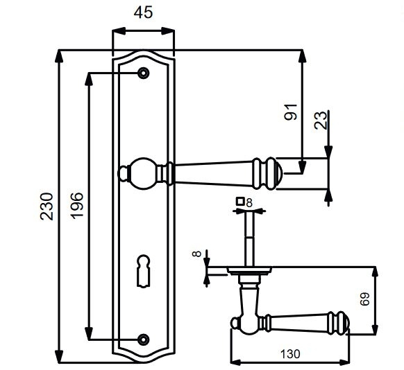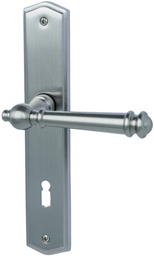 Stal nierdzewna-satynowana tarcza jest ograniczona na obu końcach subtelnymi łukami. Przechodzi w stożkową klamkę z fantazyjnymi detalami. Dzięki sprężynie podtrzymującej wewnątrz, zapewniona jest trwała pozioma pozycja klamki. Wysokiej jakości konstrukcja zestawu gwarantuje niezawodną funkcjonalność nawet przy dużym obciążeniu.