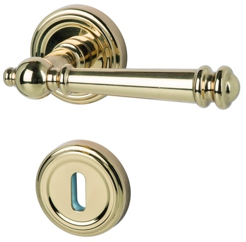 • Błyszczący mosiądz i bogate zdobienia na klamce i rozetach