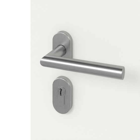 • Dwie klamki Inox w kształcie litery L i owalne rozetki