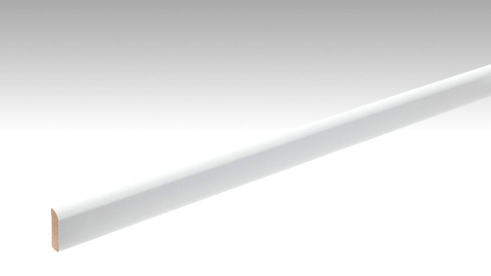 Perfekcyjnie ukrywa szczeliny dylatacyjne między podłogą a ścianą: Dzięki jednolitej białej błyszczącej folii dekoracyjnej, ta listwa przypodłogowa dopasowuje się do niezliczonych indywidualnych stylów wnętrz. Listwa z profilem 6 jest prosta i minimalistyczna. Zaokrąglona górna krawędź zapewnia szczególnie łagodne przejście między podłogą a ścianą. Montaż jest możliwy poprzez przyklejenie listwy lub przybicie jej do ściany.