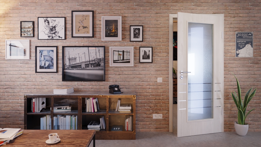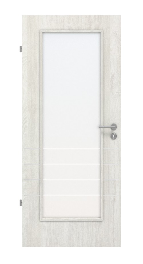 Dzięki połączeniu jasnego wykończenia jesionowego i dużego przeszklenia powstaje otwarta aranżacja przestrzeni mieszkalnej. Cztery paski w dolnej części skrzydła drzwiowego umiejętnie łączą te dwa elementy.