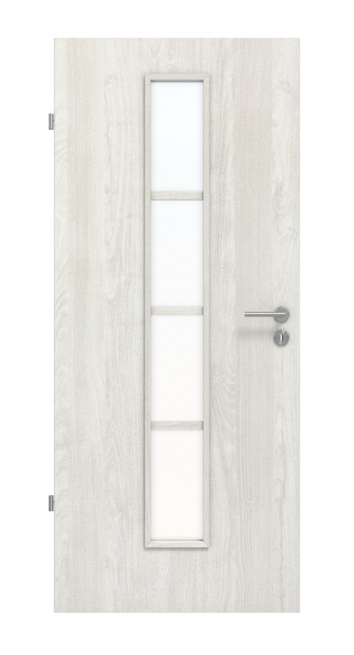 W środkowej części skrzydła drzwiowego znajduje się wąski, podzielony na cztery części otwór okienny . W przypadku szkła możesz wybierać między przezroczystym wyglądem a opcją satynową. Połączenie dekoru jesionowego i przeszkleń tworzy otwarty design.