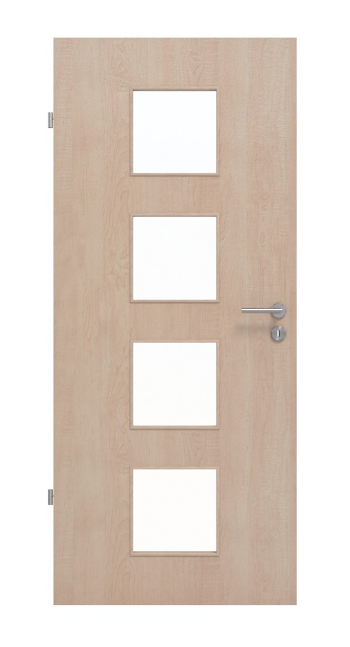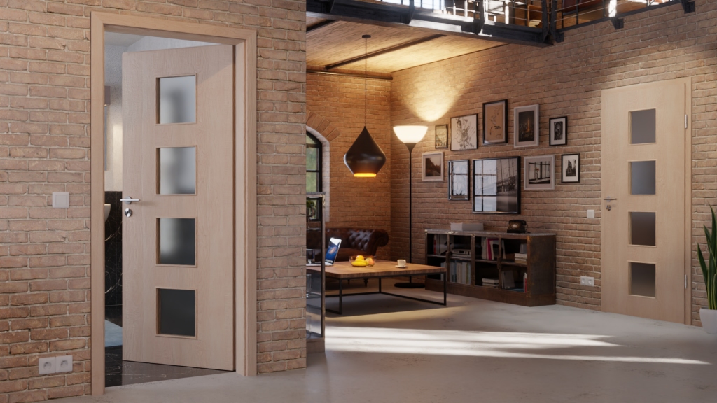 Naturalna harmonia między otworem świetlnym a drzwiami drewnianymi: Impregnowane laminatowe drzwi wewnętrzne Jeld-Wen z serii Optima łączą listwę szklaną z wytrzymałym fornirem z prawdziwego drewna w kolorze Nova Klon.