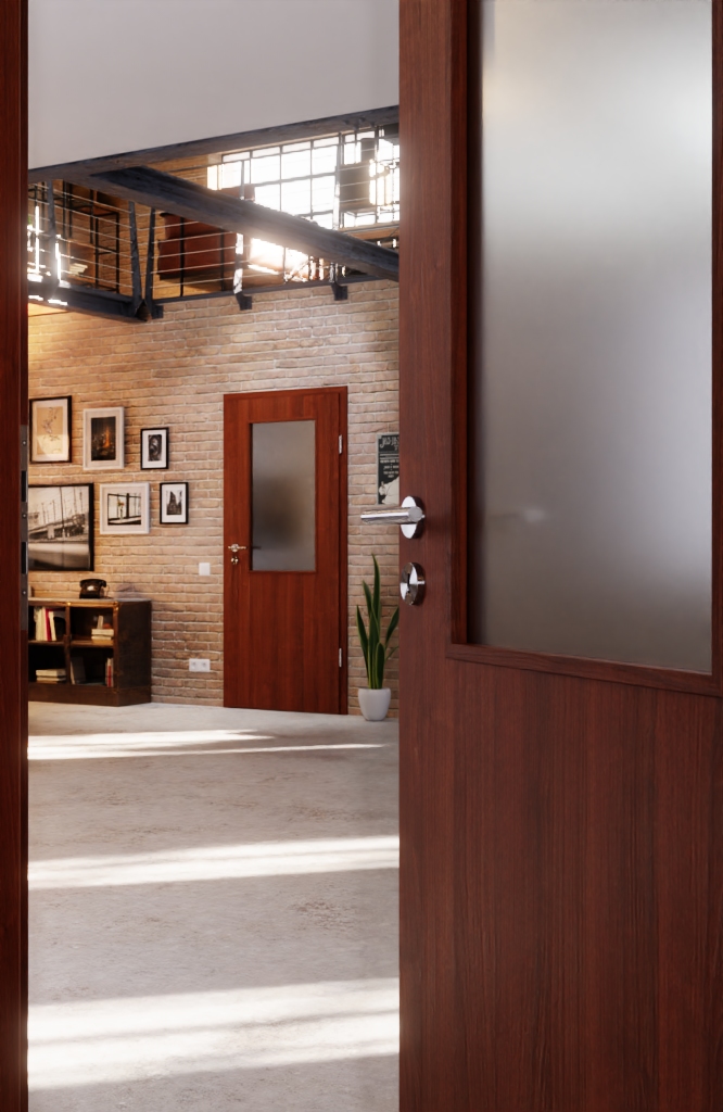 Mieszanka ciepłego wykończenia w kolorze orzecha włoskiego i przeszklenia na wysokości oczu zapewnia przyjazną atmosferę w pomieszczeniu. Istnieje wybór między szkłem przezroczystym a satynowanym.