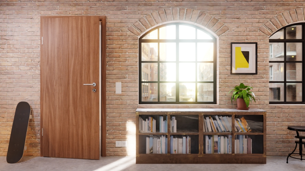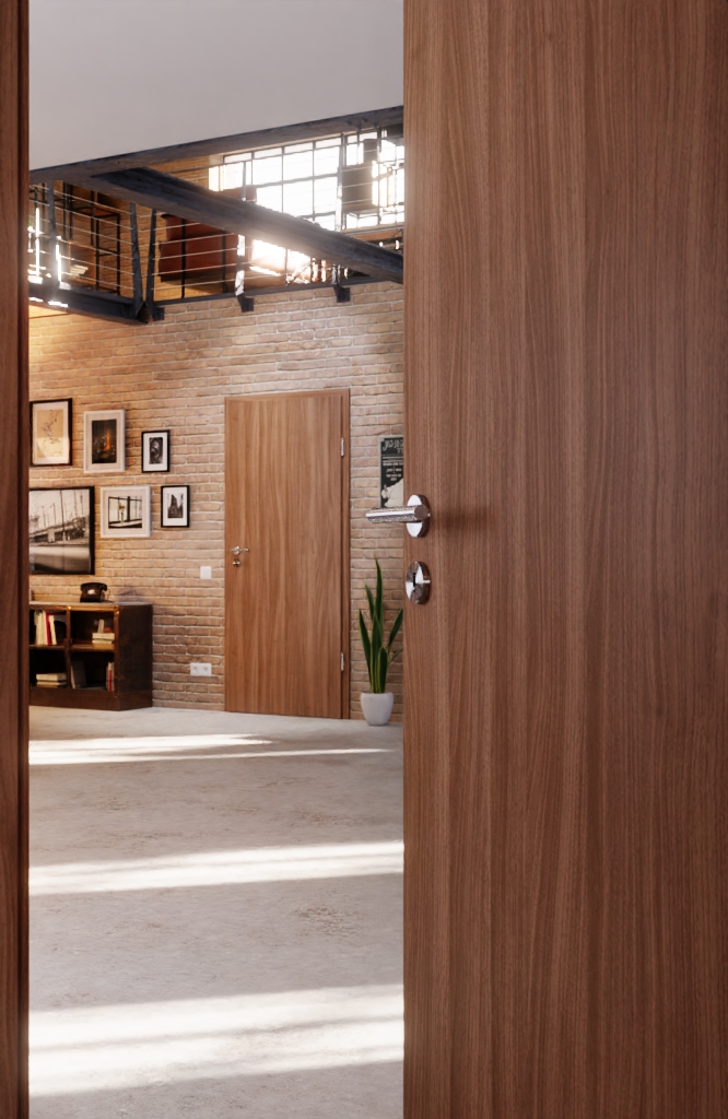 Biorąc pod uwagę jej powierzchnię, szczególnie polecana jest do obiektów komercyjnych, takich jak magazyny, zakłady produkcyjne i biura. Papier dekoracyjny oraz ochrona overlay są prasowane razem z wielowarstwowymi papierami kraftowymi. Dzięki temu jest odporna na czynniki zewnętrzne takie jak uderzenia, ciepło i wilgoć. Pozostaje również odporna na zarysowania i ścieranie. Płyta wiórowa i pełna płyta są dostępne jako opcje wypełnienia drzwi.
