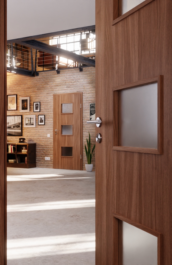 Bardzo odporna powierzchnia F z reprodukcją drewna jest równie charakterystyczna dla drzwi wewnętrznych, jak i zróżnicowane odcienie kolorów, które podkreślają charakter drewna.