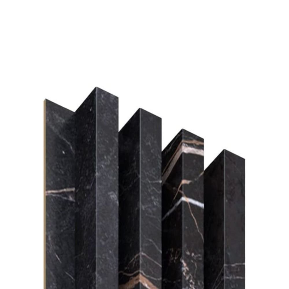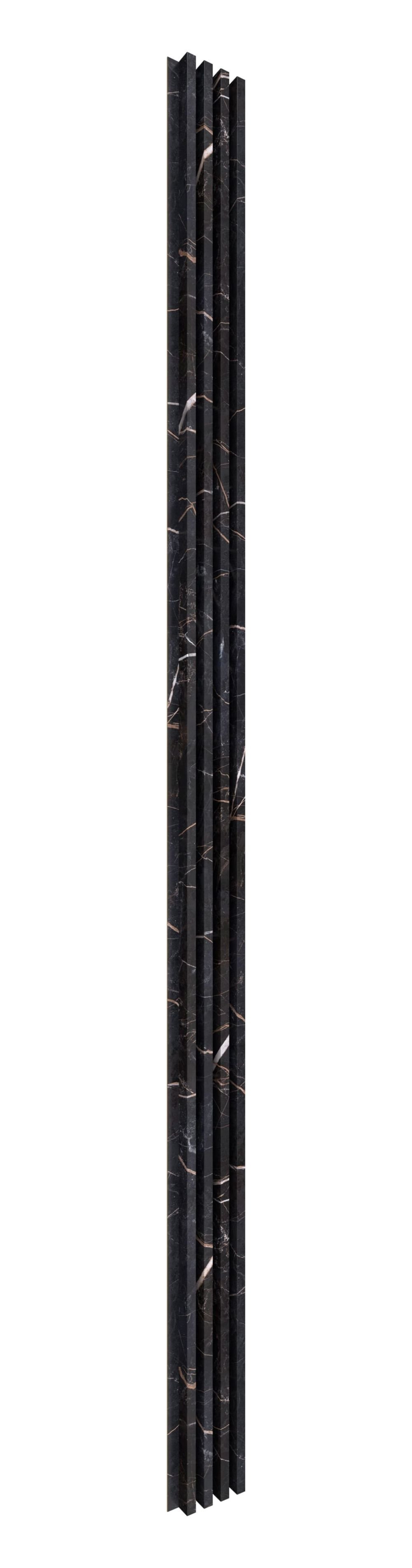 Na powierzchni 240 x 15,9 cm rozmieszczono równomiernie po 4 lamele (20 x 30 mm). Powierzchnia jest pokryta imitacją marmuru, która dzięki delikatnym białym żyłkom wygląda bardzo autentycznie. Panel można zamontować zarówno na ścianie, jak i na suficie.