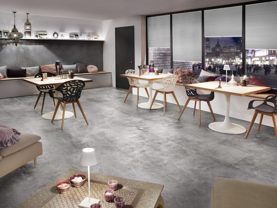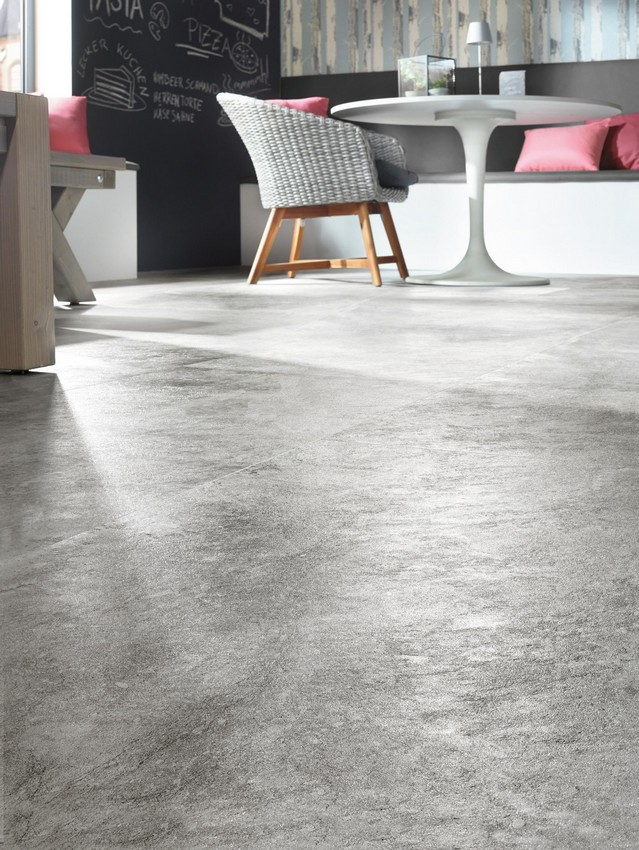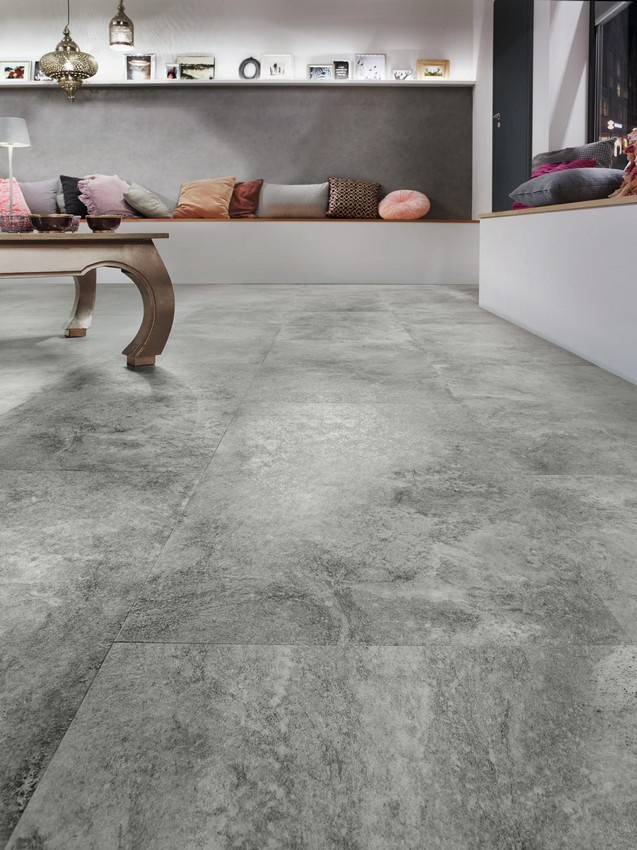 Połączenie atrakcyjnych odcieni szarości i minimalistycznych kamiennych akcentów nadaje charakter wnętrzu wyjątkowy charakter. Dzięki wyjątkowo miękkiej i przyjemnej w dotyku powierzchni z autentycznym wzorem kamienia podłoga zachwyca również pod względem wrażeń dotykowych.