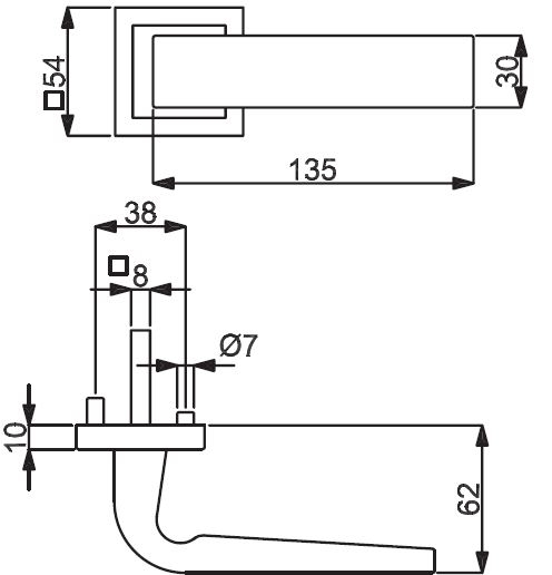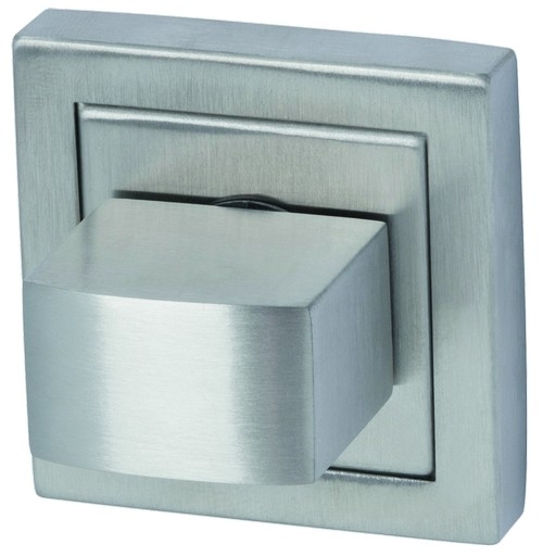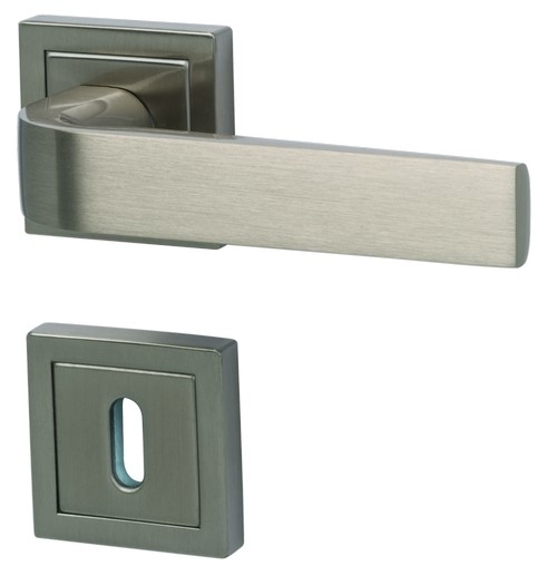 Kwadratowe rozetki i kanciasty uchwyt drzwiowy nadają urok modelowi w kolorze satynowanego stali nierdzewnej. Sprężyna podtrzymująca zapewnia optymalną pozycję klamki.