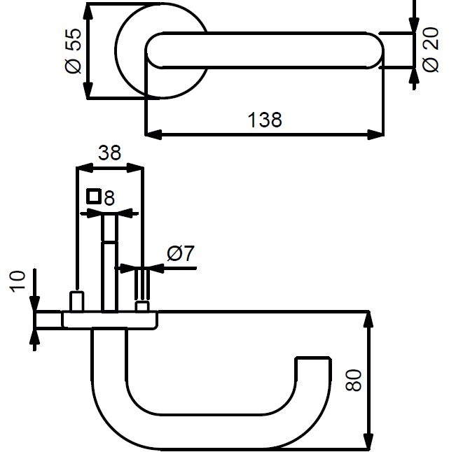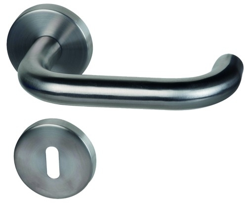Okrągłe rozetki i kulisty gałka w tym modelu spotykają się z u-kształtnym uchwytem drzwiowym. Zintegrowana sprężyna powrotna zawsze przywraca klamkę do poziomu.