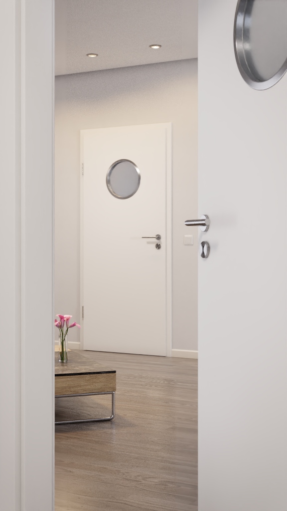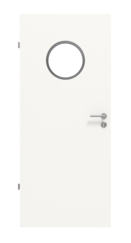 W górnej części drzwi znajduje się wycięcie na szkło. Dzięki podwyższonej lokalizacji widok w Twoim pomieszczeniu jest ograniczony. Standardowo oprawione w stal nierdzewną lub opcjonalnie w lite drewno bukowe, bullauge wpuszcza światło z góry.