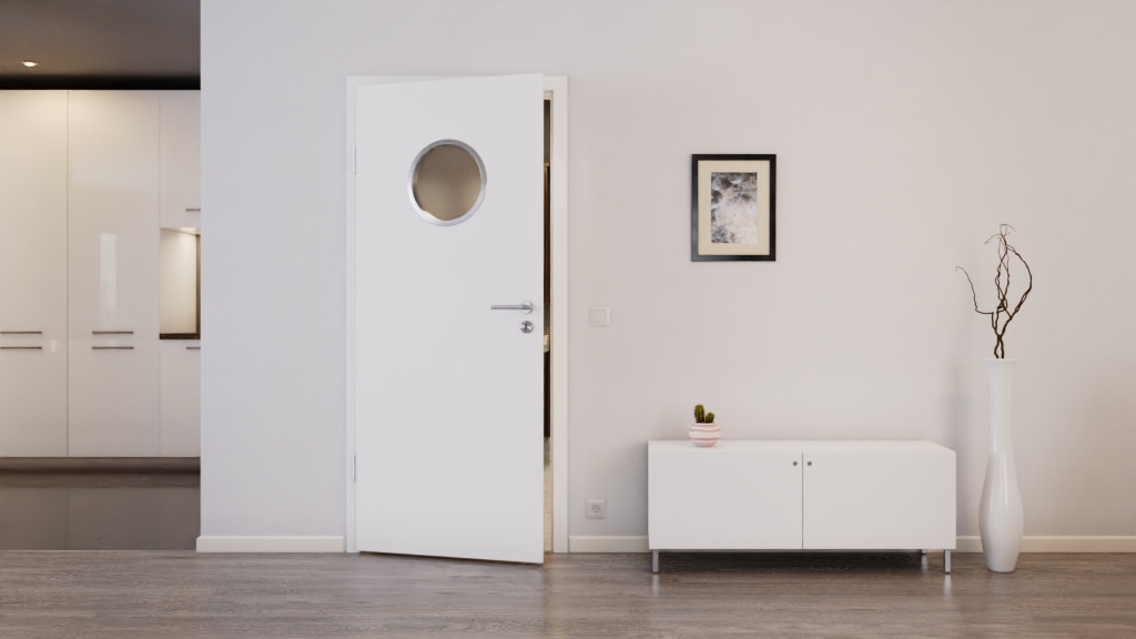okrągły otwór świetlny w górnej części skrzydła drzwiowego