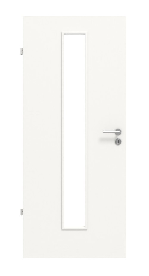 Otwór szklany, dzięki wąskiemu umiejscowieniu na środku, pozwala na widok przez całą wysokość skrzydła drzwiowego.