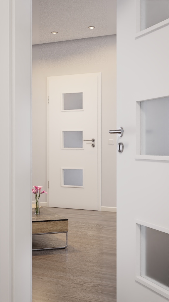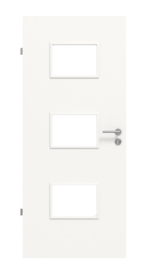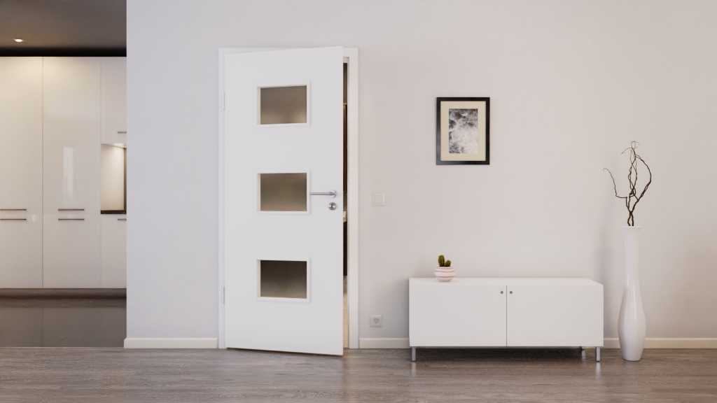 Trzy prostokątne przeszklenia są umieszczone jedno nad drugim w środku drzwi wewnętrznych. Dzięki temu wpuszczają światło, umożliwiają widok na drugą stronę i chronią przed stłuczeniem szkła w dolnej części drzwi.