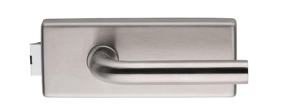 Okucie zachwyca solidną powierzchnią przypominającą stal nierdzewną, która na delikatnych drzwiach szklanych stanowi stylowy akcent. Klasyczny kształt L klamki oraz prosty, prostokątny zamek harmonijnie łączą się w elegancką całość z wyczuciem czystego designu.