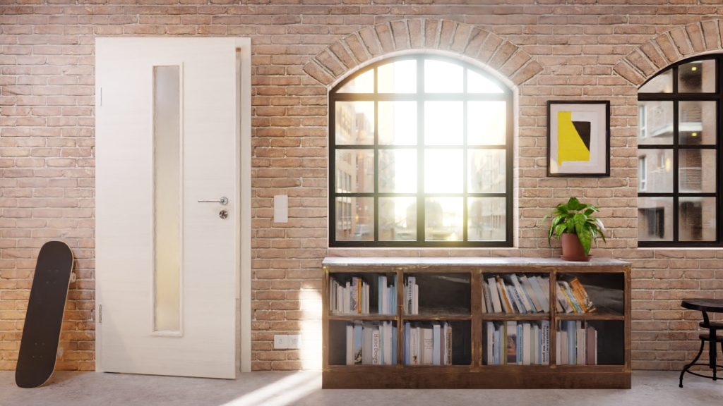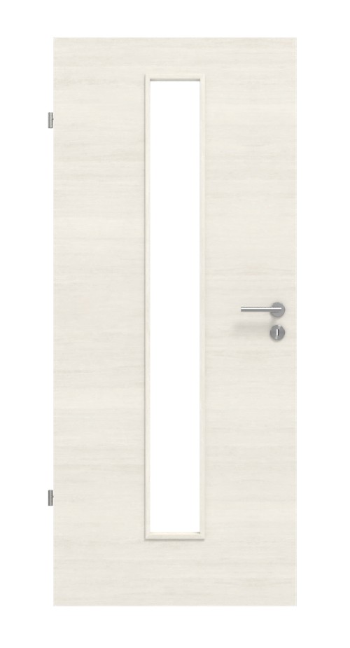 Wykusz świetlny z nałożonymi listwami w kanciastym kształcie nadaje pomieszczeniu nowoczesny wygląd. Jest wąski i umieszczony w środku drzwi. Wykusz umożliwia widok na całą wysokość skrzydła drzwiowego.