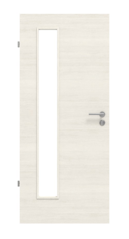 Prostokątne okno świetlne z zamontowanymi listwami wprowadza nowoczesną atmosferę. Jest wąskie i znajduje się po stronie zawiasów drzwi. Wydłużone okno na całą wysokość drzwi umożliwia widok na wydarzenia po przeciwnej stronie.