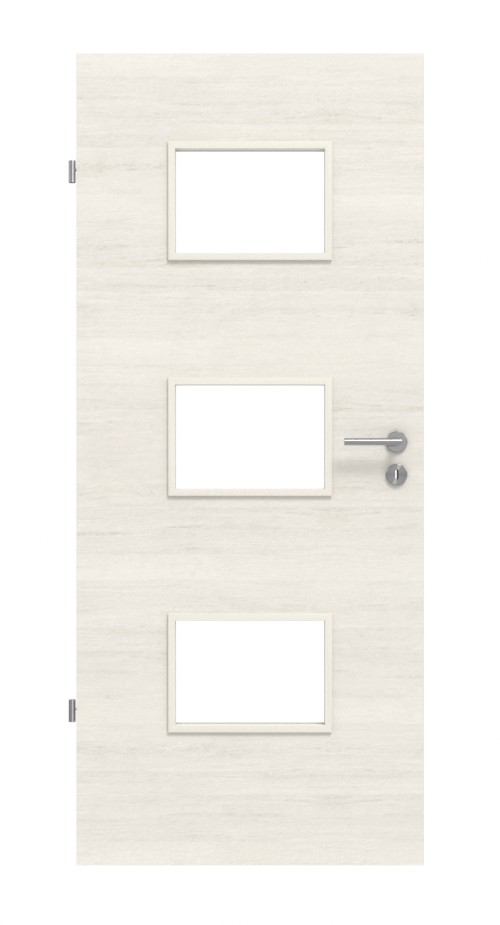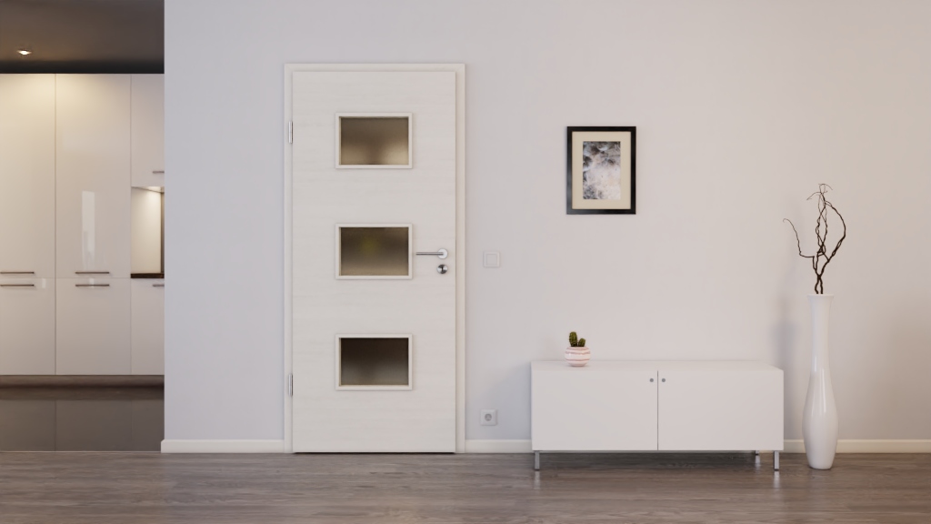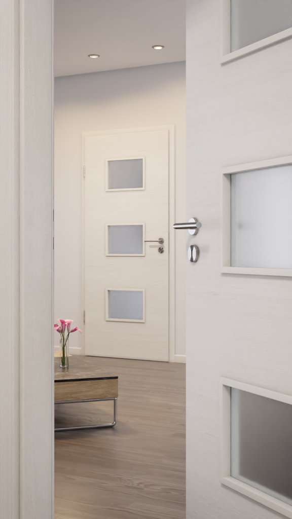 Otwór świetlny z nałożonymi listwami w kształcie prostokąta nadaje pomieszczeniu nowoczesny klimat. Oznacza to trzy prostokątne otwory świetlne ułożone jeden nad drugim w środku drzwi. Dzięki temu uzyskuje się również widok na drugą stronę drzwi, a dolna część jest chroniona przed uszkodzeniami szkła.