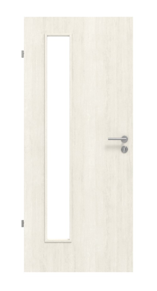Prostokątne przeszklenie z zamontowanymi listwami wprowadza nowoczesną atmosferę. Jest wąskie i znajduje się po stronie zawiasów drzwi. Wydłużone przeszklenie na całej wysokości drzwi umożliwia podgląd na to, co dzieje się po drugiej stronie.